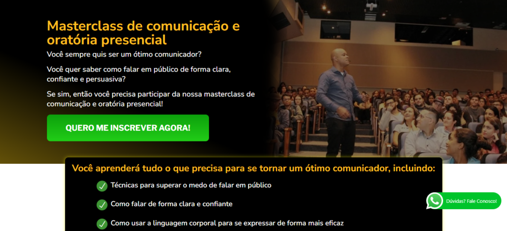 Masterclass de comunicação e oratória presencial Você sempre quis ser um ótimo comunicador? Você quer saber como falar em público de forma clara, confiante e persuasiva? Se sim, então você precisa participar da nossa masterclass de comunicação e oratória presencial! QUERO ME INSCREVER AGORA! Você aprenderá tudo o que precisa para se tornar um ótimo […]